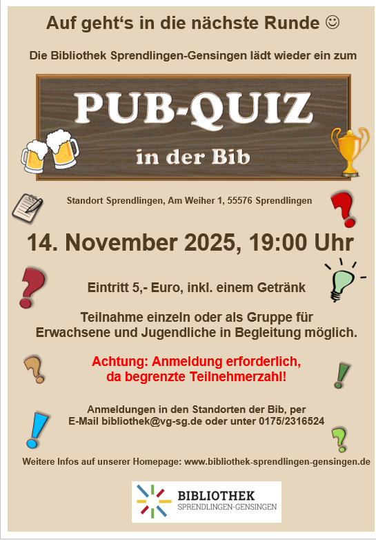 Ein Pub-Quiz ist ein Ratespiel, in welchem Teams gegeneinander antreten, um ihr Wissen in einer geselligen Atmosphäre zu testen. Die Teilnehmer beantworten Fragen aus verschiedenen Kategorien wie z.B. Musik, Geschichte, Wissenschaft, Pop und Sport. Es geht nicht nur um das Gewinnen, sondern auch um den Spaß und die spannenden Diskussionen.